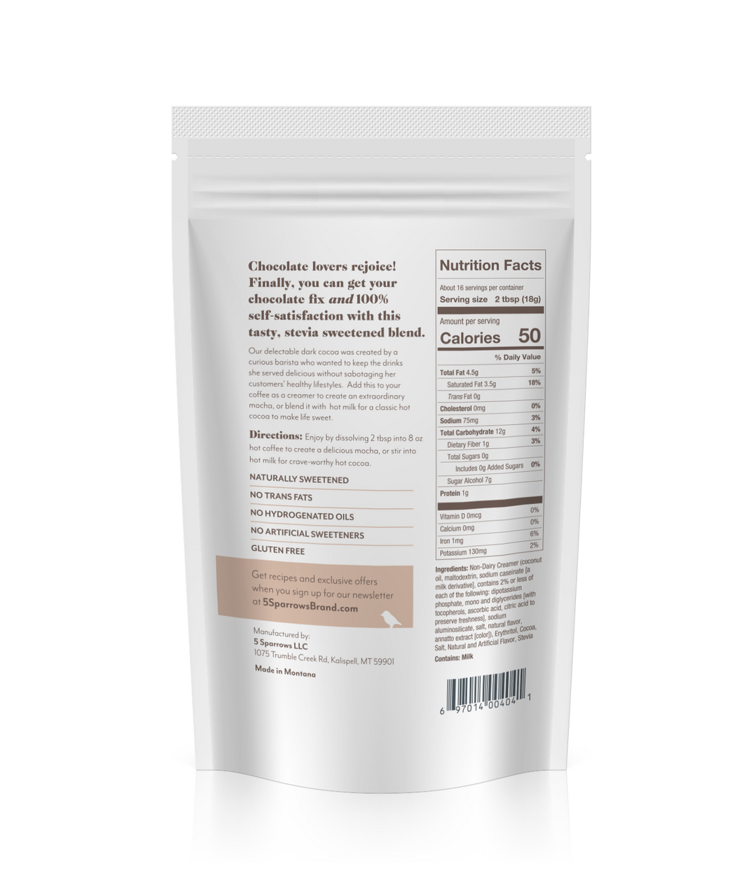 5 sparrows is proud to introduce its revolutionary naturally sweetened sugar free product: sugar free coffee house chocolate · naturally sweetened with stevia and xylitol · mixes easily with no clumping · Superior flavor profile and no aftertaste · made in Montana with premium ingredients, sourced from around the world · Small batch, Handcrafted · developed by baristas *Stevia: Produced from a member of the daisy family, stevia is an all-natural sweetener with zero calories, zero carbohydrates and a zero glycemic index. *Xylitol: Found in natural sources, such as fruits and vegetables, Xylitol is a familiar sweetener in sugar-free products such as chewing gum. Xylitol also reduces the incidence of tooth decay.